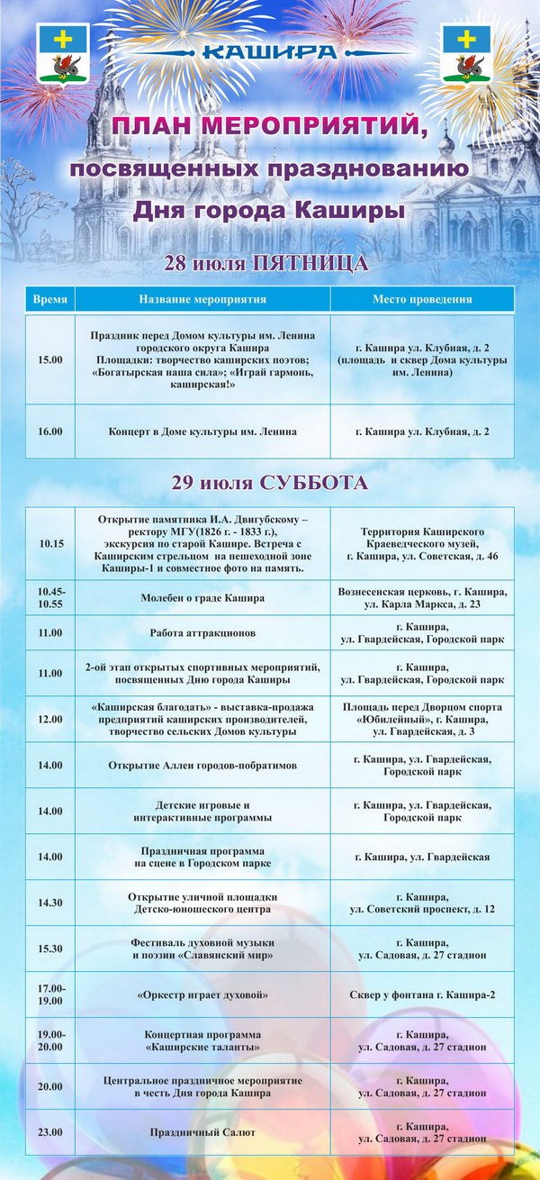 В последнюю субботу июля, 29.08.2017 очередную годовщину со дня основания празднует город Кашира, Московская область. Основные мероприятия пройдут 29 июля, в субботу. В честь праздника подготовлена замечательная праздничная программа, принять участие в которой смогут как жители, так и гости города. В афишу мероприятий включены детские игровые и интерактивные программы, различные спортивные мероприятия, тематические выставки, концертные программы и праздничный фейерверк.