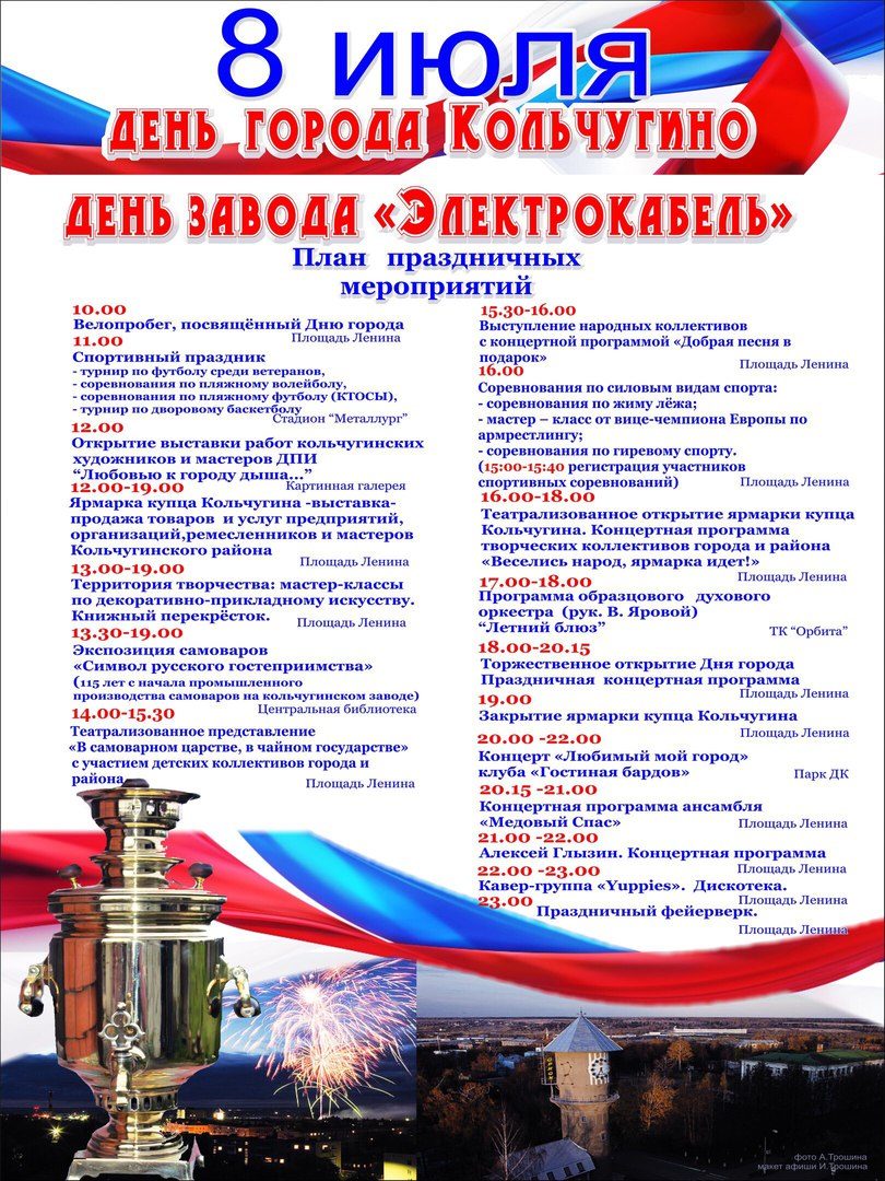 Уже в ближайшую субботу город Кольчугино отмечает очередную годовщину со дня основания. Для жителей и гостей города подготовлена насыщенная праздничная программа. Приглашаем всех желающих принять участие в спортивных мероприятиях, ярмарках тематических театральных представлениях. Самые основные мероприятия пройдут на Площади Ленина. Приглашаем вас на концерт, и конечно же кульминация праздника – праздничный фейерверк!